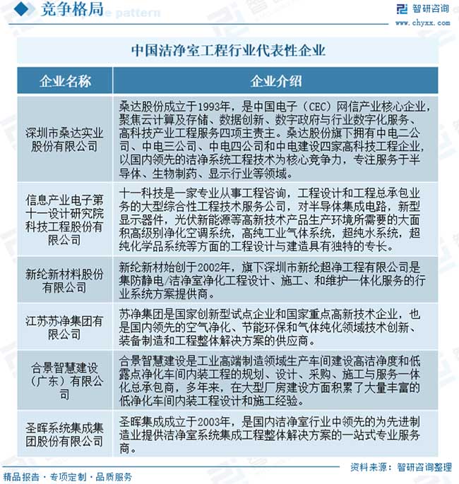 超潔凈環(huán)境控制又融合了風(fēng)險評估、生產(chǎn)認(rèn)證的概念和程序,加之潔凈技術(shù)跨行業(yè)、跨專業(yè)、跨學(xué)科的特點,使得潔凈室工程的難度和復(fù)雜性增加。因此對于潔凈室工程行業(yè)來說,優(yōu)化設(shè)計、現(xiàn)場施工環(huán)境的協(xié)調(diào)與管控、工程相關(guān)技術(shù)細(xì)節(jié)的經(jīng)驗積累,對客戶需求的理解和實現(xiàn),以及對設(shè)計變更的準(zhǔn)備和響應(yīng)程度等都是衡量潔凈室工程企業(yè)競爭能力的重要指標(biāo)。?目前,我國潔凈室工程行業(yè)競爭較為激烈,企業(yè)數(shù)量較多。其中,桑達(dá)股份、十一科技、蘇凈集團(tuán)、新綸新材、柏誠股份、亞翔集成等設(shè)計研究院或建設(shè)承包企業(yè)在降低建造成本、提高潔凈室的穩(wěn)定性等方面占據(jù)優(yōu)勢,能提供高端潔凈室系統(tǒng)集成解決方案,位居行業(yè)領(lǐng)先地位。同時,行業(yè)內(nèi)還存在大量規(guī)模較小、技術(shù)水平與綜合解決方案能力有限的潔凈室工程企業(yè),普遍集中在對潔凈等級要求不高的低端市場。