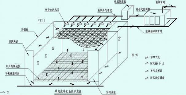 氣流→初效凈化→加濕段→加熱段→表冷段→中效凈化→風機送風→管道→高效凈化風口→吹入房間→帶走塵埃細菌等顆粒 → 回風百葉窗→初效凈化 重復以上過程,即可達到凈化目的。