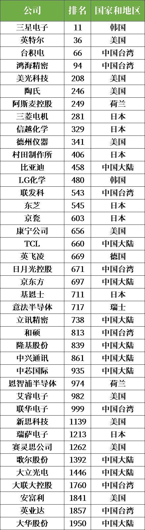 據統計2000強榜單中有41家半導體相關公司其中包括中國大陸企業10家中國臺灣企業9家