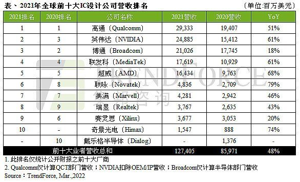 據TrendForce集邦咨詢研究顯示2021年由于各類終端應用需求強勁導致晶圓缺貨全球IC產業嚴重供不應求連帶使芯片價格上漲拉抬2021年全球前十大IC設計業者營收至1,274億美元年增48%